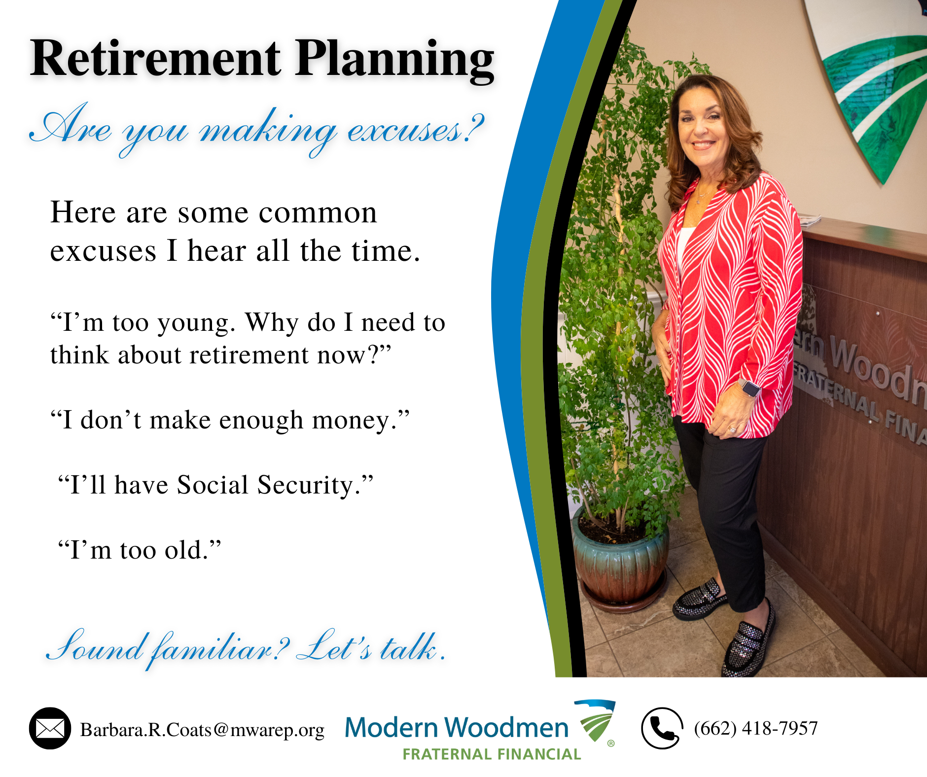 Retirement planning can feel overwhelming, which is why so many people put it off. But even small steps can make a meaningful difference over time. You don’t have to have everything figured out to begin. You just have to start. If you're tired of making excuses, I’d love to share some helpful tips. #retirement #modernwoodmen #planningahead #starkville